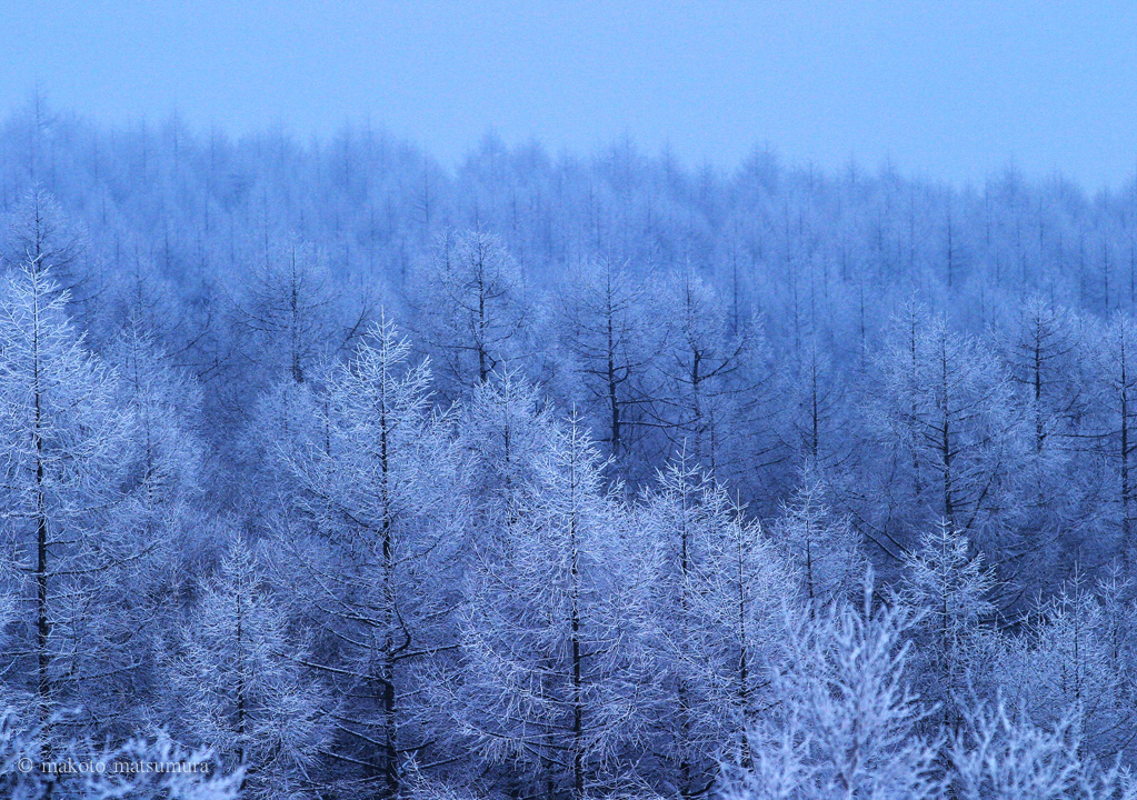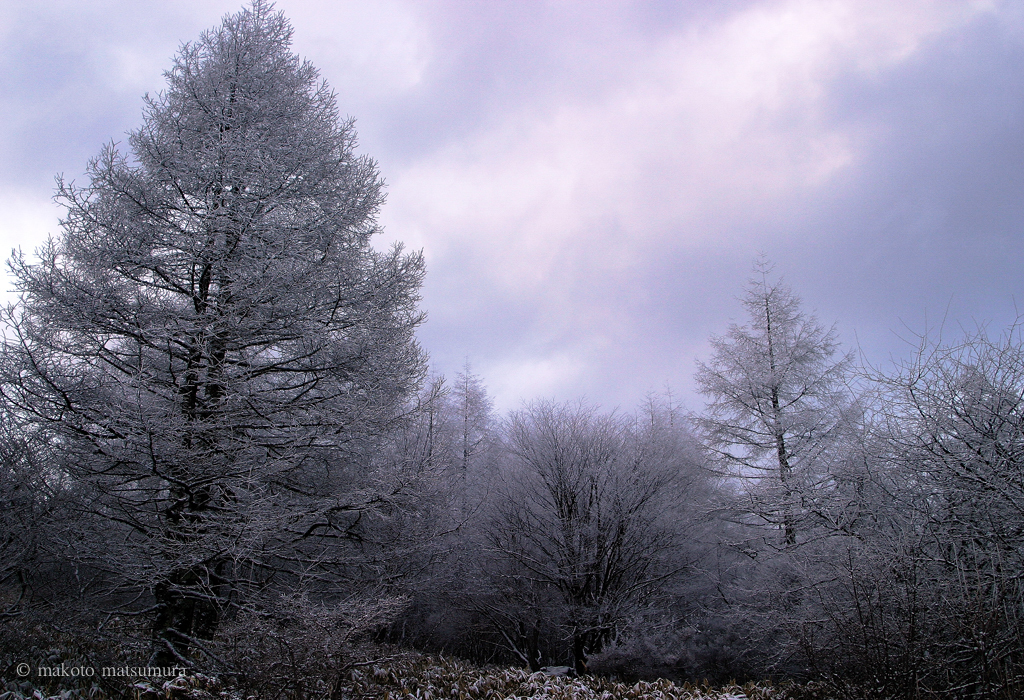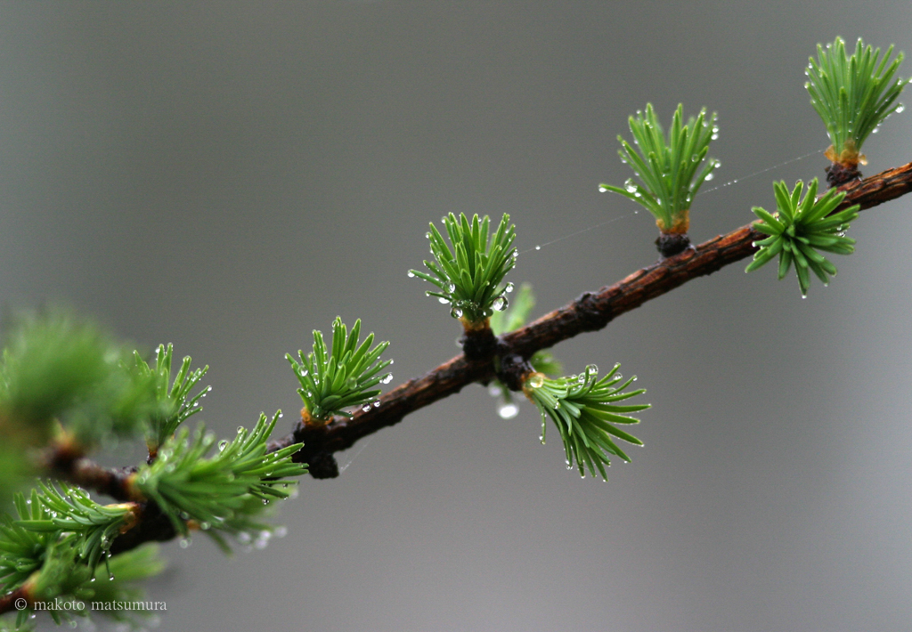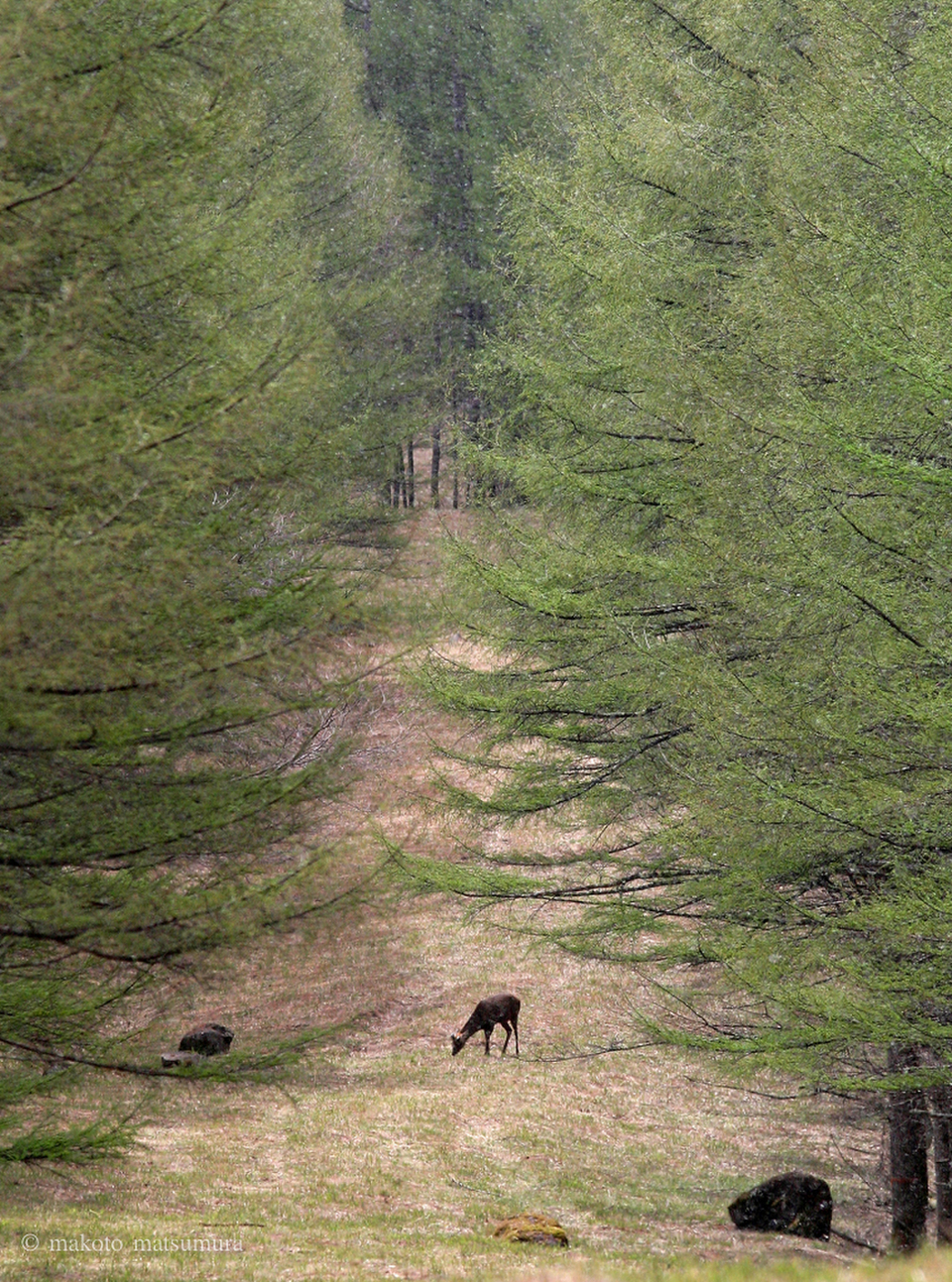 4月28日。芽吹くカラマツ林は時ならぬ淡雪に濡れた。