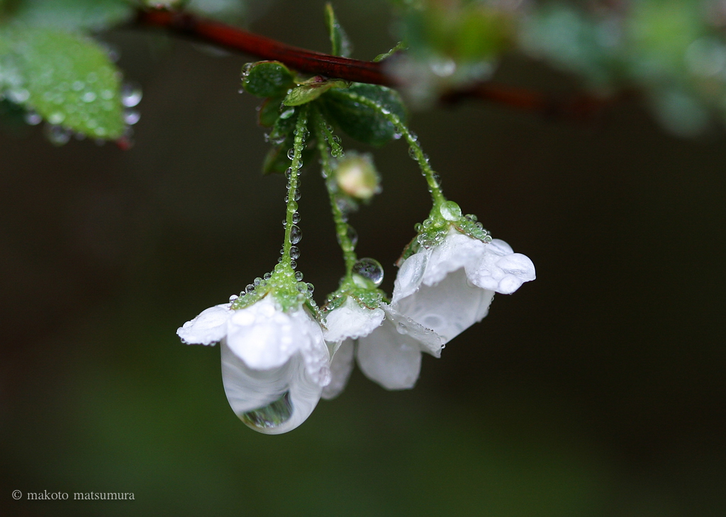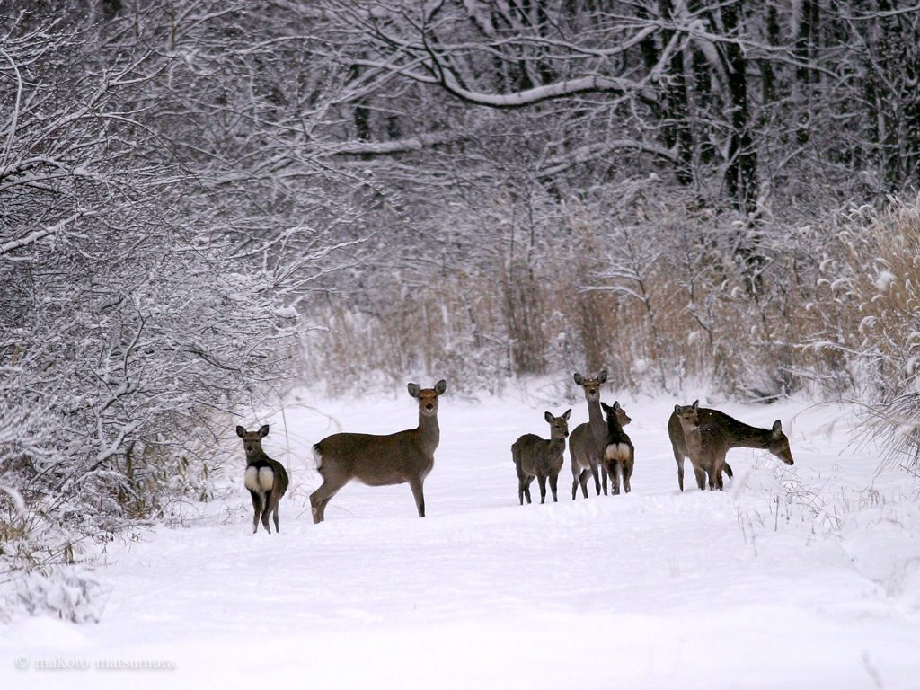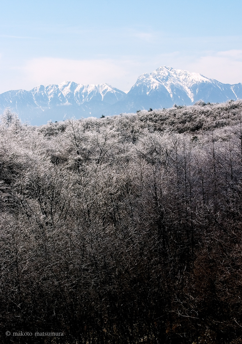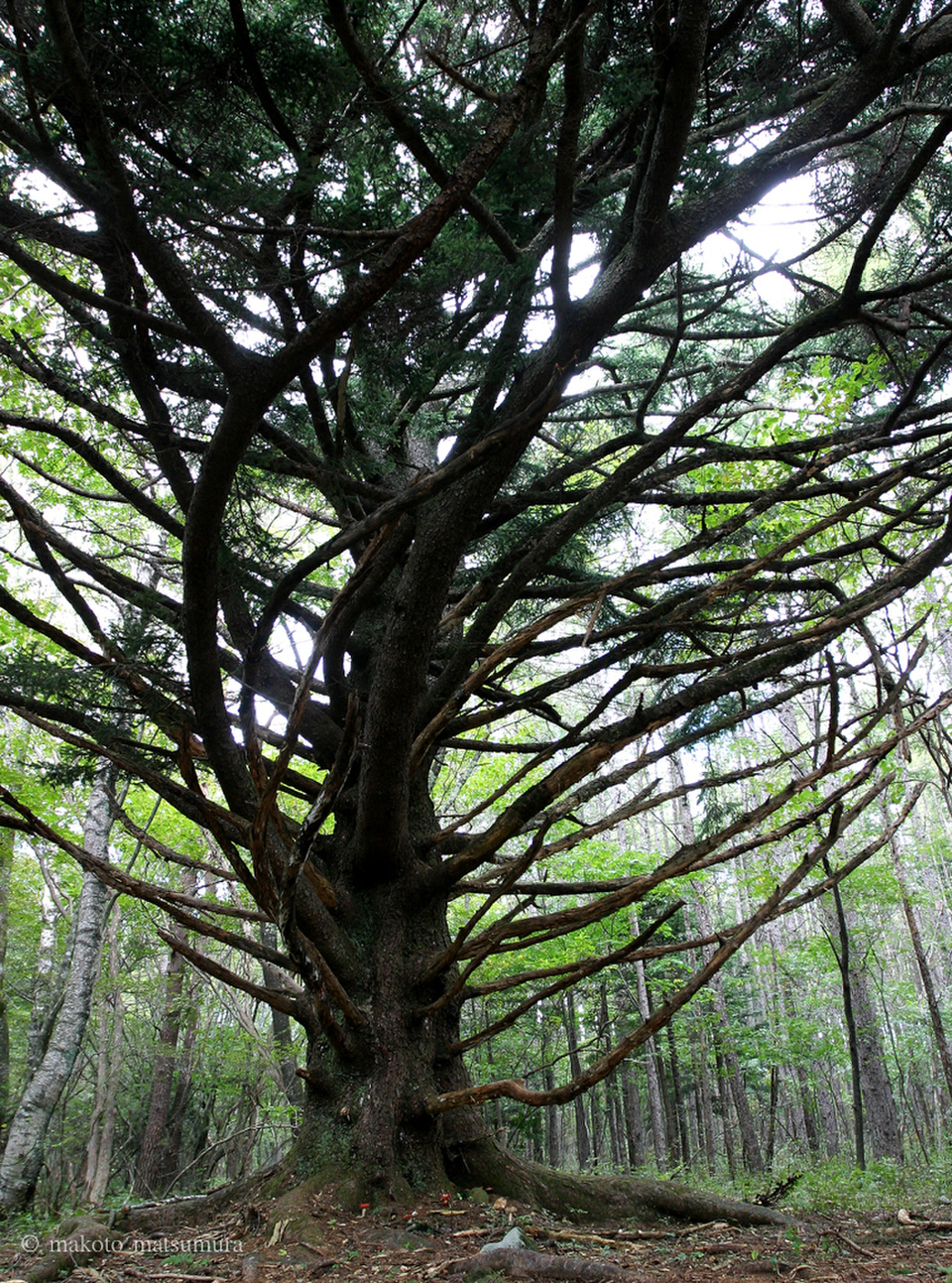 4月28日。芽吹くカラマツ林は時ならぬ淡雪に濡れた。